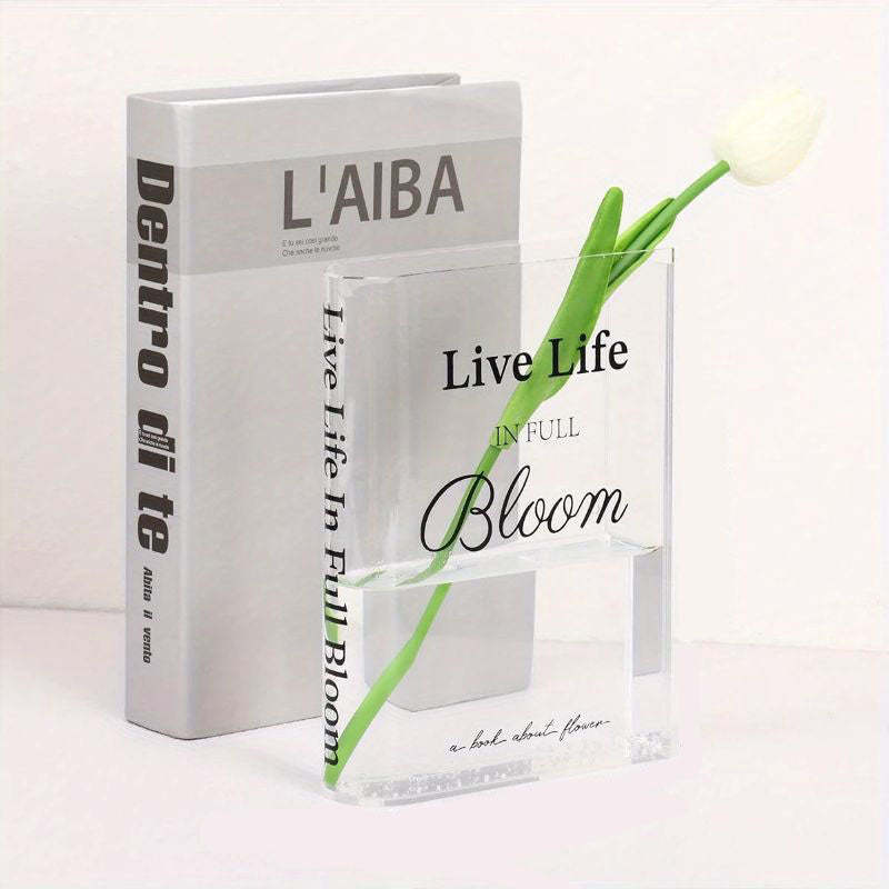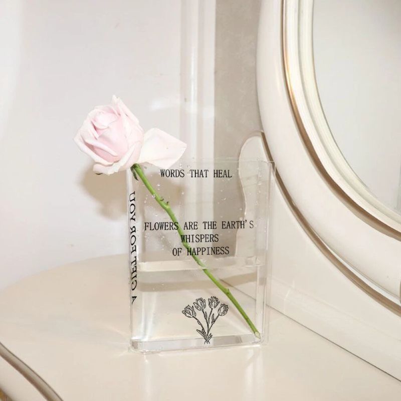 - The gentle curve beneath the spine of our book-inspired vase, visible in the image above, arises from the acrylic molding process, not a flaw. We trust you'll appreciate this unique touch.