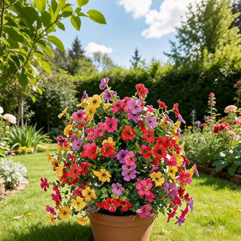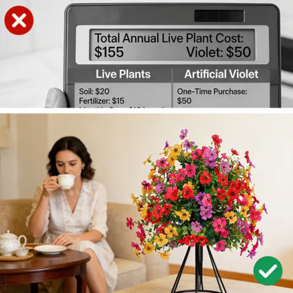 Regular fake plants turn that embarrassing grayish-blue after one month in the sun due to Solar Polymer Degradation. These artificial violets use specialized UV-resistant materials that reflect UV rays instead of absorbing them, keeping colors vivid for years.