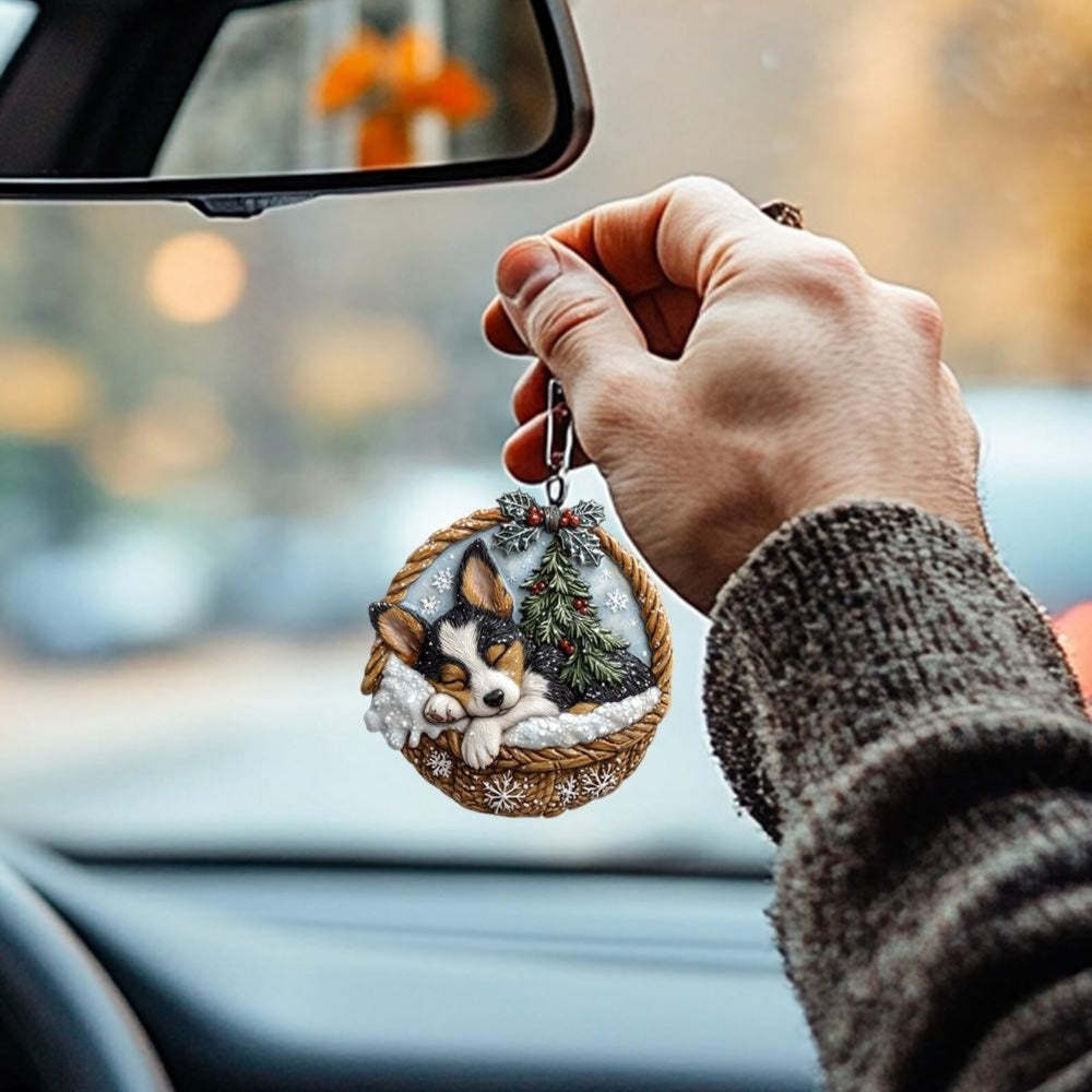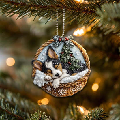 Our Mini Baskets Ornament adds a touch of whimsy and warmth to your home. Perfect for dog lovers, this decor features a charming and playful design depicting a peacefully sleeping pooch. Whether you hang it on your Christmas tree, use it as a keychain, or simply display it on your bookshelf, it'll bring a touch of cheer to any space.