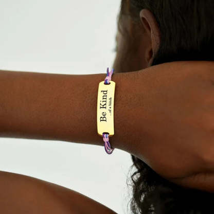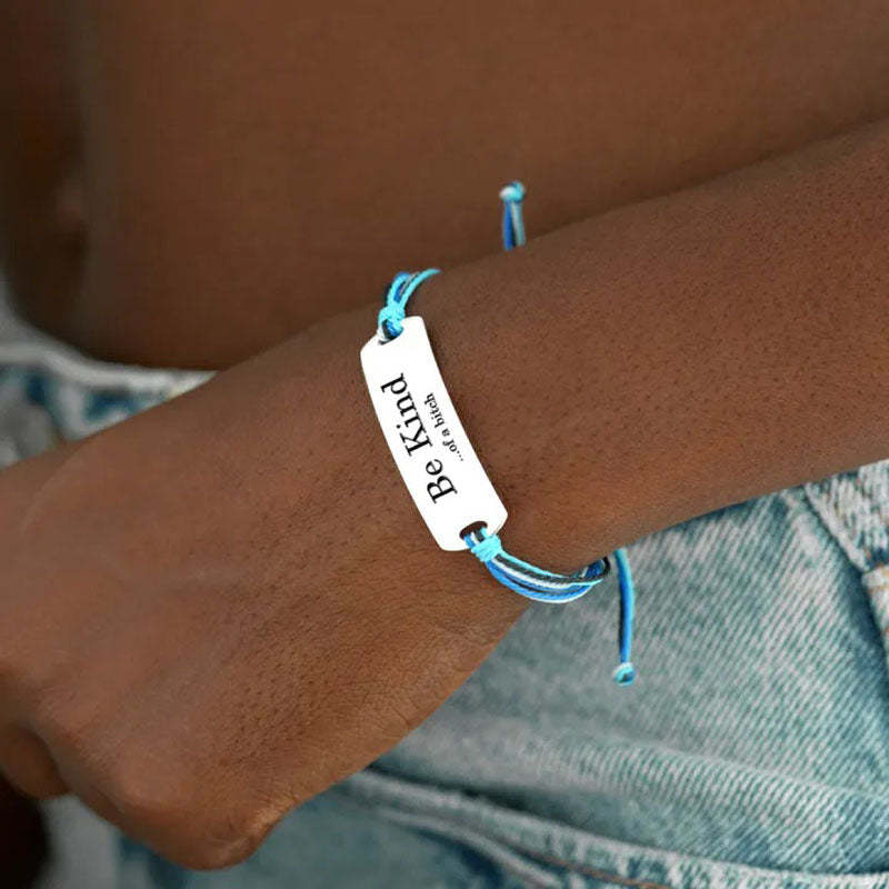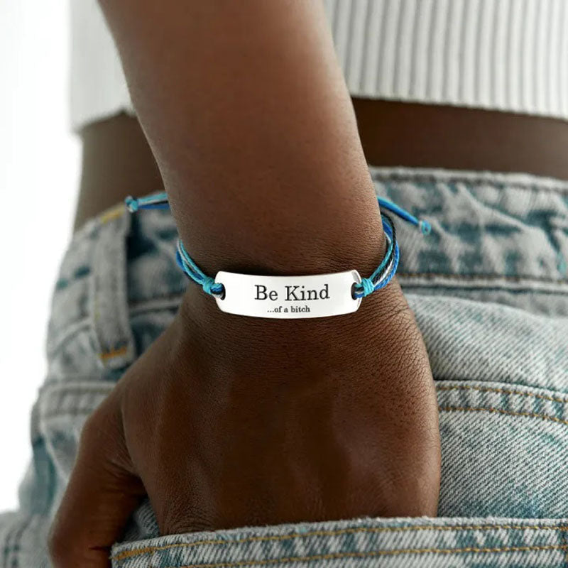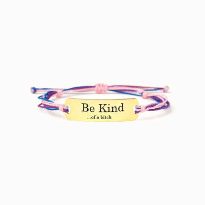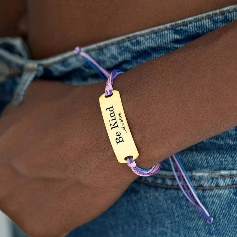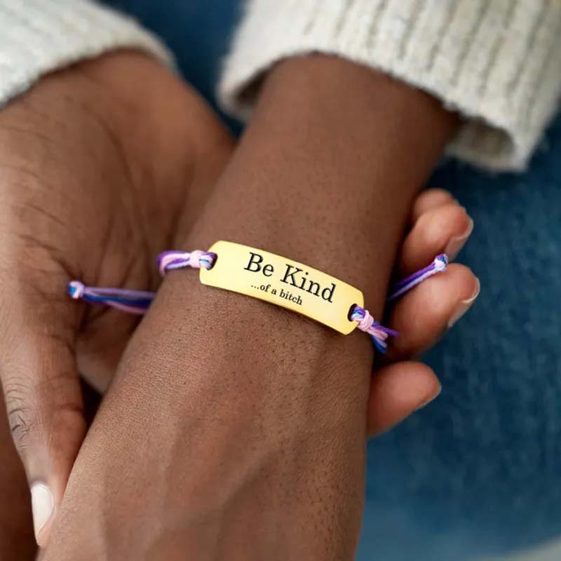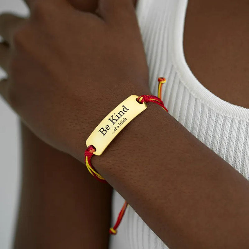 This fun-loving Engraved Bracelet offers a sneaky and tongue-in-cheek way to stay kind, even on your moodiest days. With a dainty, simple ring band and cheeky engravings on the bar, this bracelet is sure to put a smile on your face. ❤️🎁
