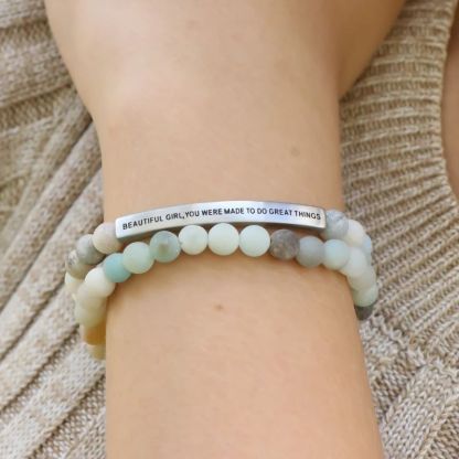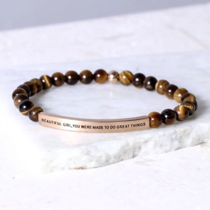 This bracelet will motivate you to achieve genuine greatness. It will encourage you to expand your abilities and cultivate your talent. And like a dormant volcano, the fire that lies deep within you will flow to the surface to ignite your passion and spark your potential. When you feel doubt and fear, look down at your bracelet and remember BEAUTIFUL GIRL, YOU WERE MADE TO DO GREAT THINGS.