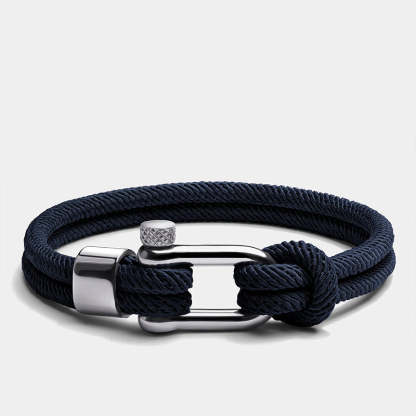 Constructed from hard-wearing and fade-resistant nylon marine cord, with classic silver-plated shackle closure, the navy blue double strand is knotted around the polished hardware.