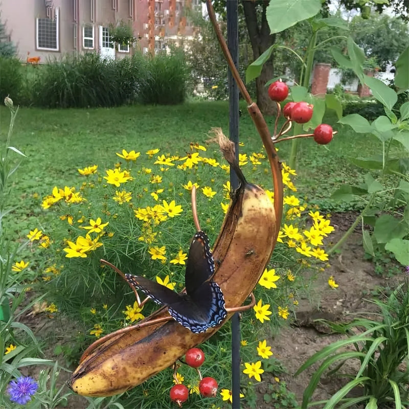 🦋A copper vine with two clusters of red berries is shaped to hang the banana. Butterflies feed on very ripe bananas.
