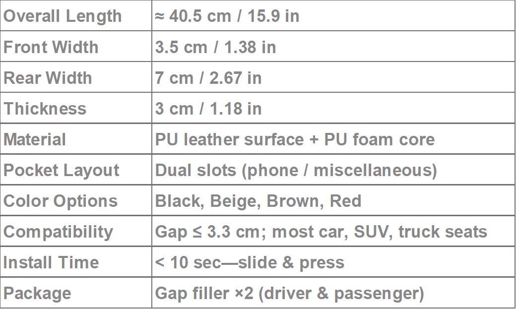 Slides snugly between seat and console to seal the gap, so phones, cards and coins stay out of the “black hole.”