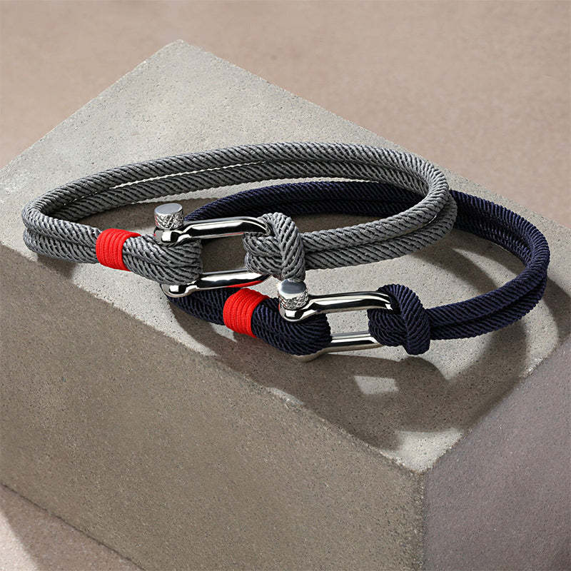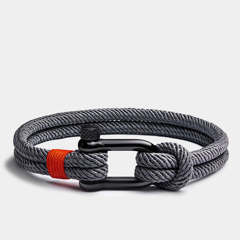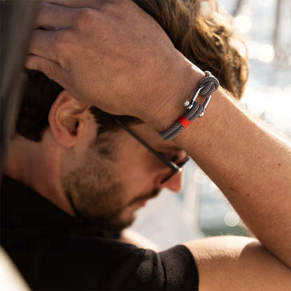 Constructed from hard-wearing and fade-resistant nylon marine cord, with classic silver-plated shackle closure, the gray double strand is knotted around the polished hardware and juxtaposed with the red nylon thread.