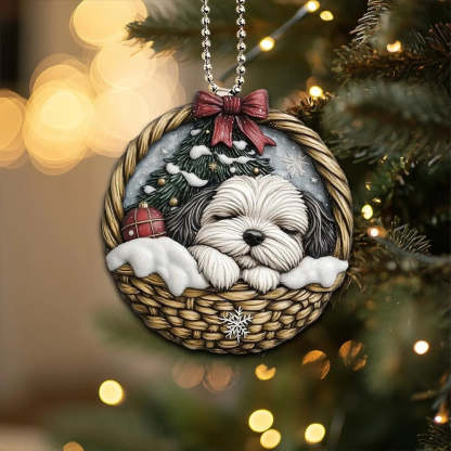 Our Mini Baskets Ornament adds a touch of whimsy and warmth to your home. Perfect for dog lovers, this decor features a charming and playful design depicting a peacefully sleeping pooch. Whether you hang it on your Christmas tree, use it as a keychain, or simply display it on your bookshelf, it'll bring a touch of cheer to any space.