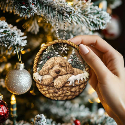 Our Mini Baskets Ornament adds a touch of whimsy and warmth to your home. Perfect for dog lovers, this decor features a charming and playful design depicting a peacefully sleeping pooch. Whether you hang it on your Christmas tree, use it as a keychain, or simply display it on your bookshelf, it'll bring a touch of cheer to any space.