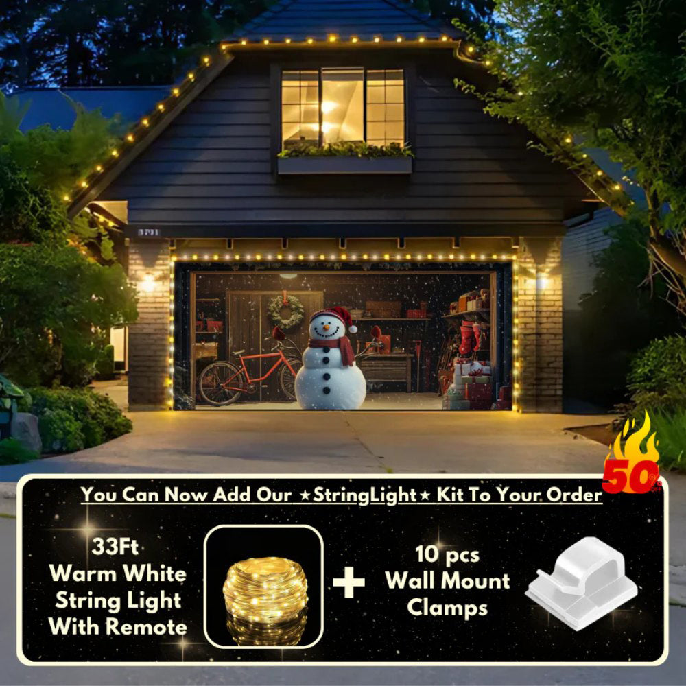Now you can elevate your holiday display with our string light kit-available at 50% off! Pair your Christmas Garage Door Cover with glowing outdoor Christmas lights and turn your garage into a true showstopper. The kit includes 1x 33 ft warm white string light, a remote control, and 10x sticky wall mount clamps.