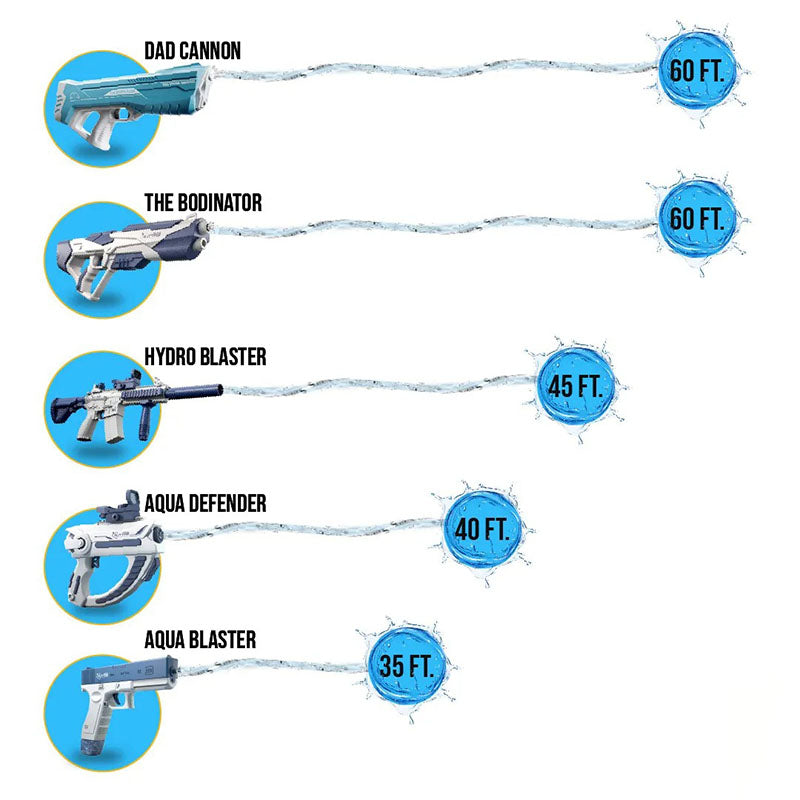 Tank Capacity is ordered from smallest to largest: Aqua Blaster, Aqua Defender, Hydro Blaster, Dad Cannon, The Bodinator.