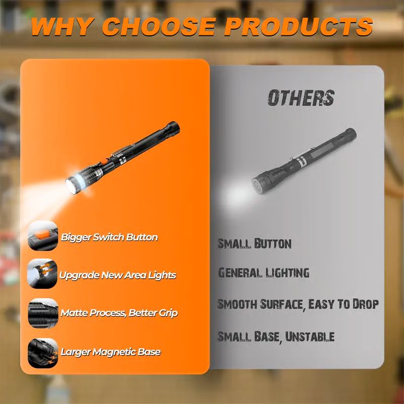 🔧2-in-1 Flashlight and Pickup Tool: Equipped with 3 LED lights to illuminate dark and narrow spaces. Telescopic design with a flexible hose and strong magnets on the head and base.💪
