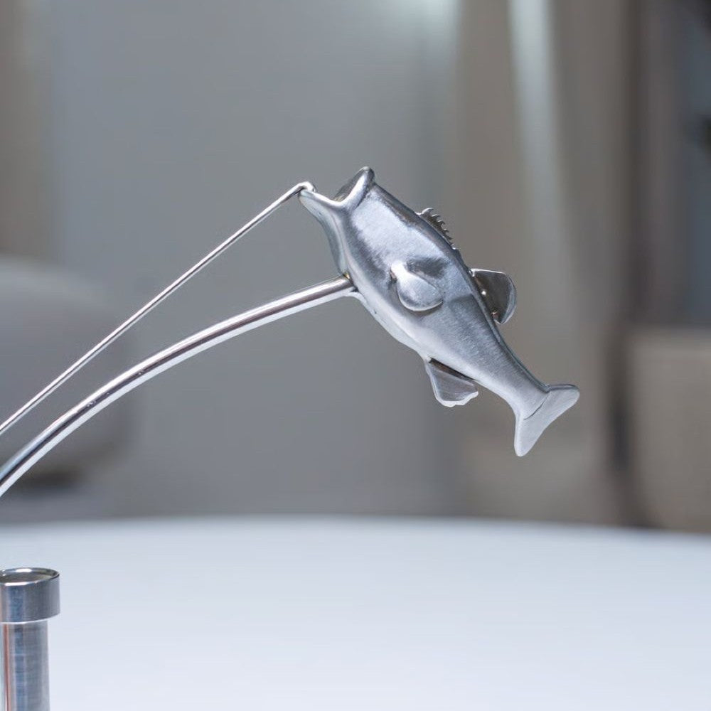 This is a really fun design to watch - the fisherman looks like he is pulling the rod side to side while the stainless steel bass looks like it is desperately trying to wiggle off the line.