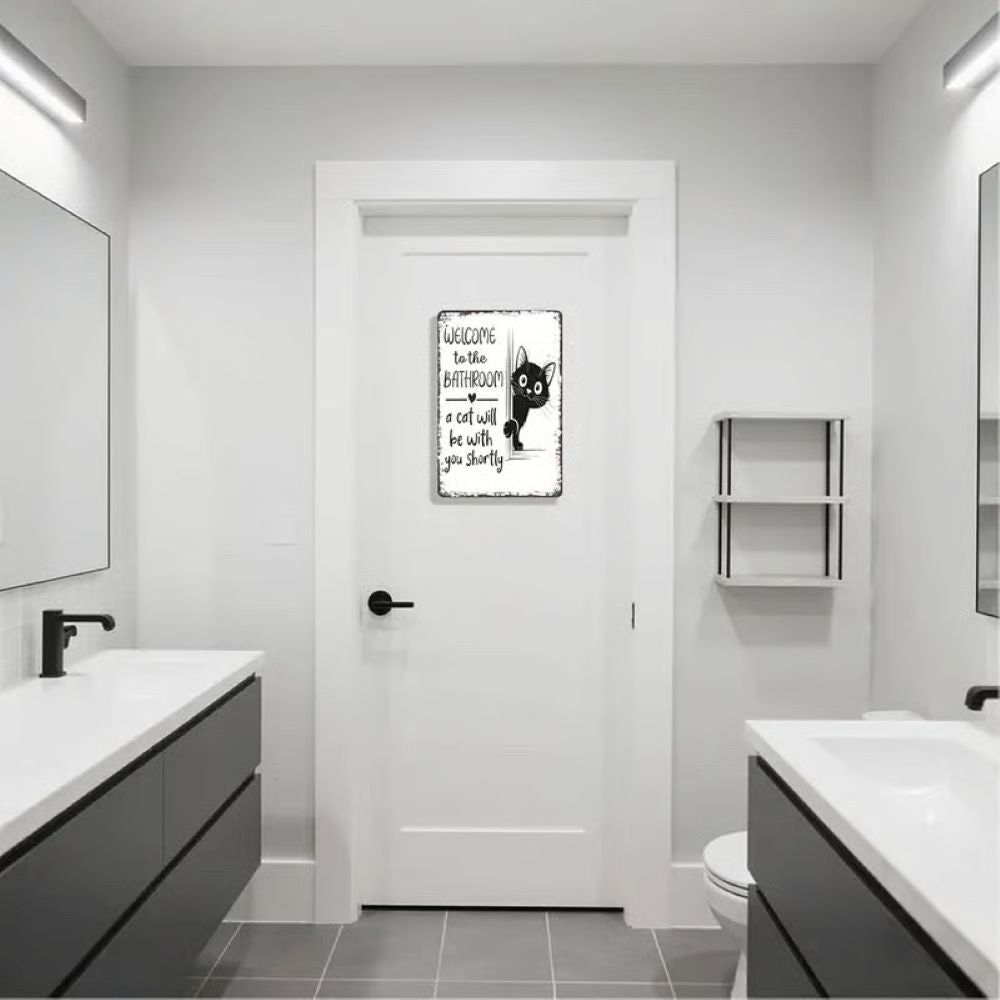 Transform your bathroom with this charming cat design! The "Welcome To The Bathroom" sign adds a whimsical, nostalgic vibe. It's crafted from durable aluminum, ensuring longevity.