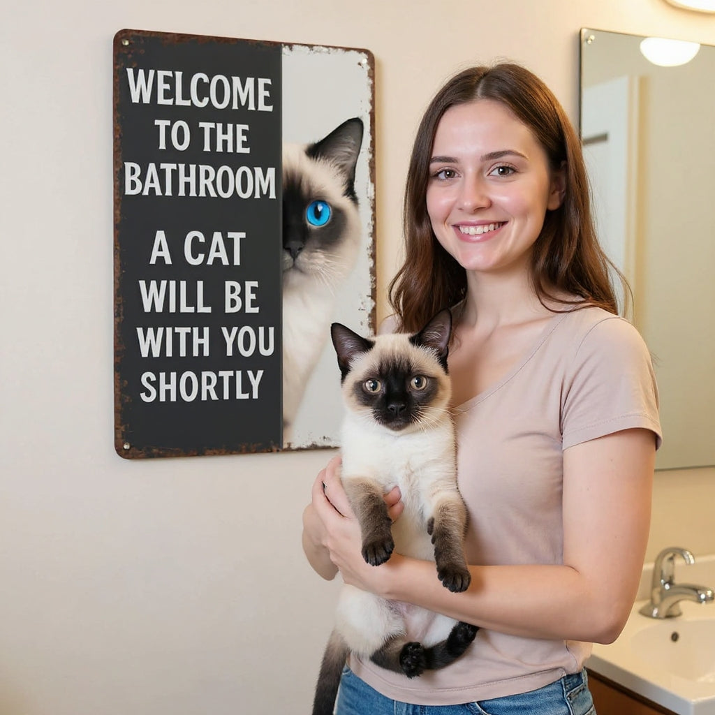 Transform your bathroom with this charming cat design! The "Welcome To The Bathroom" sign adds a whimsical, nostalgic vibe. It's crafted from durable aluminum, ensuring longevity.