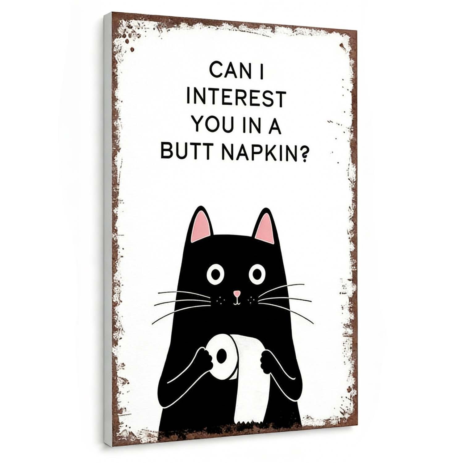 This funny black and white digital download features a cat holding a roll of toilet paper with the text that reads "CAN I INTEREST YOU IN A BUTT NAPKIN?" This print is ideal for those seeking unique animal bathroom art. Let our whimsical print create a bathroom that brings out joy and laughter. Perfect gift for cat lovers.