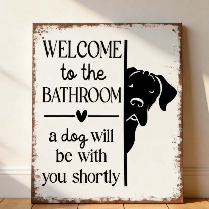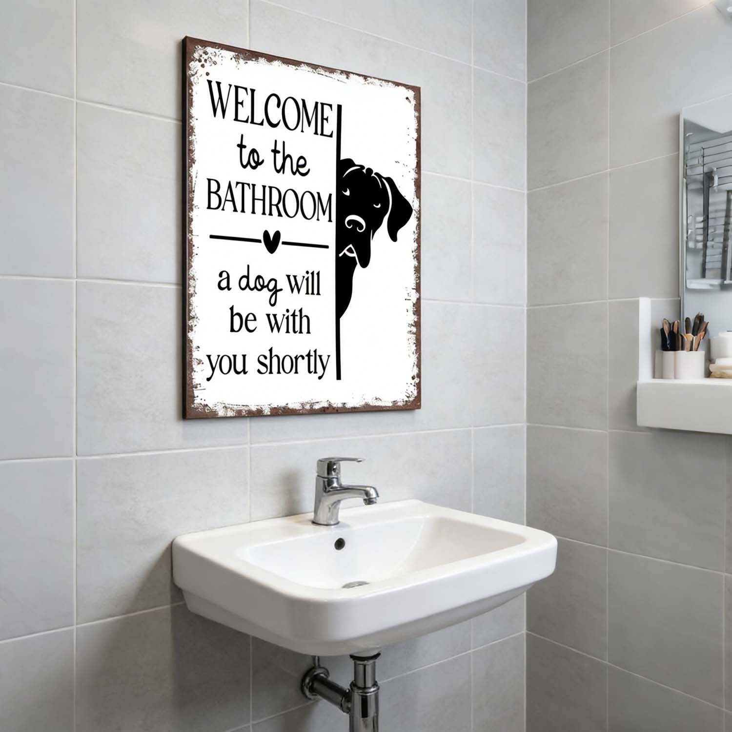 This funny black and white digital download features a dog peeking out from the side of the bathroom door with the text that reads "A DOG WILL BE WITH YOU SHORTLY". This print is ideal for those seeking unique animal bathroom art. Let our whimsical print create a bathroom that brings out joy and laughter. Perfect gift for dog lovers.