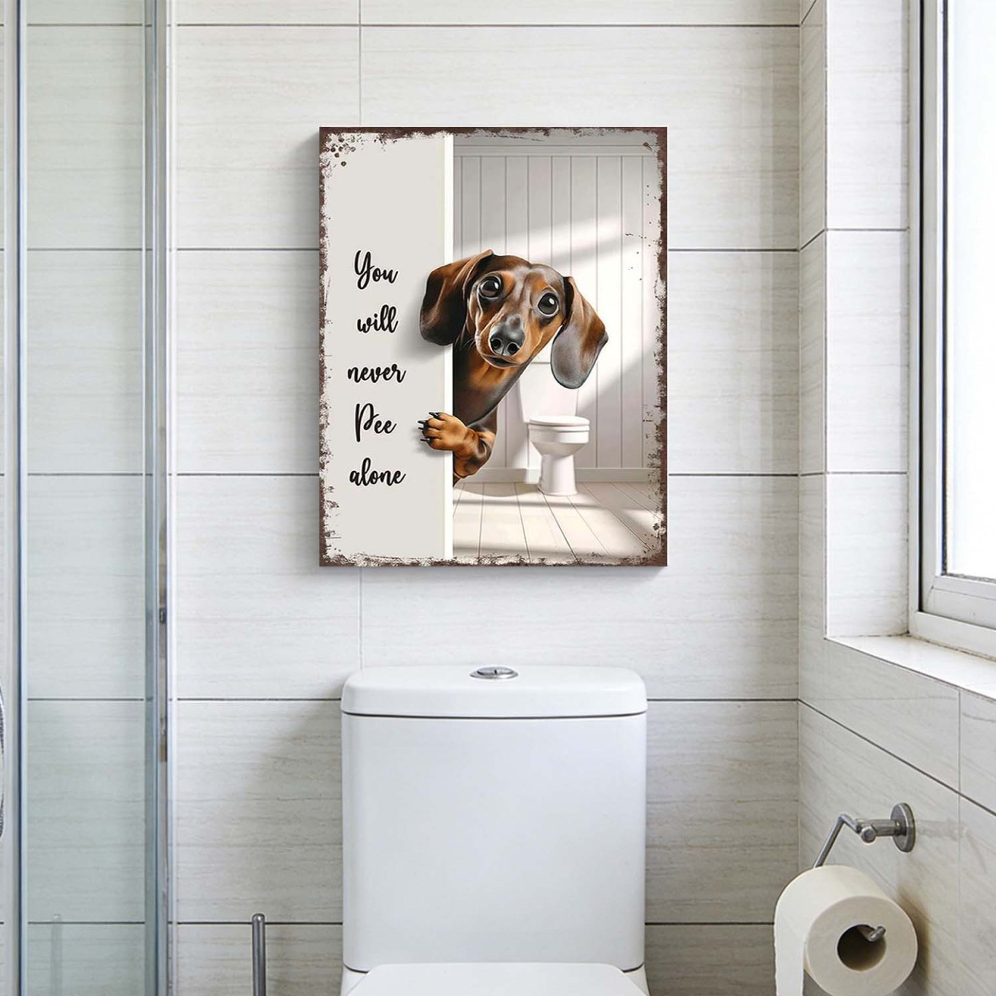 This funny black and white digital download features a dog peeking out from the side of the bathroom door with the text that reads "you will never Pee alone". This print is ideal for those seeking unique animal bathroom art. Let our whimsical print create a bathroom that brings out joy and laughter. Perfect gift for dog lovers.