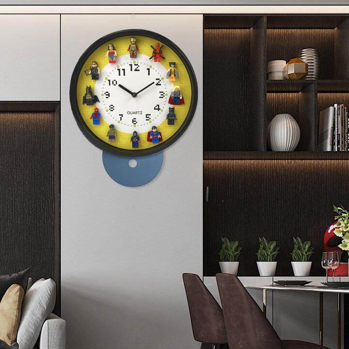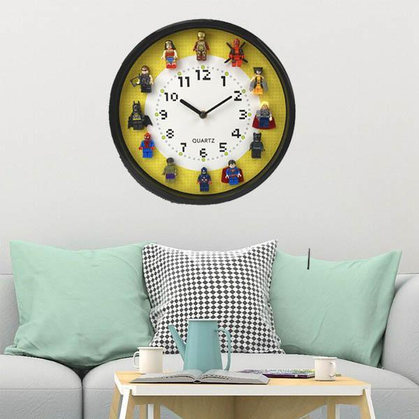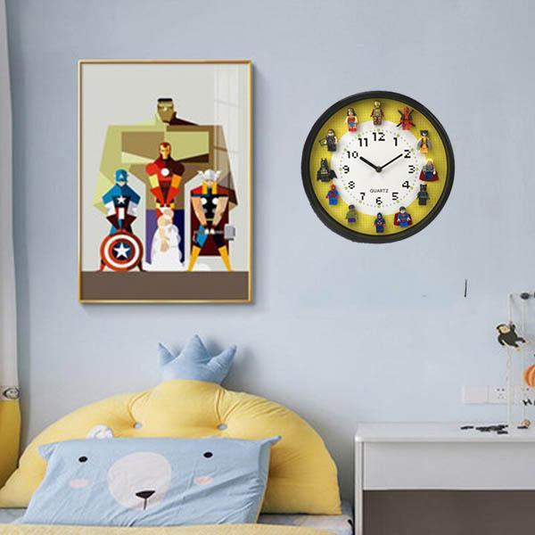 Large analog wall clock with 12 mini figures. (Superheroes)